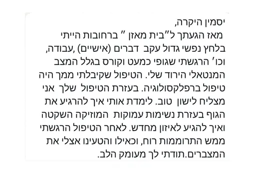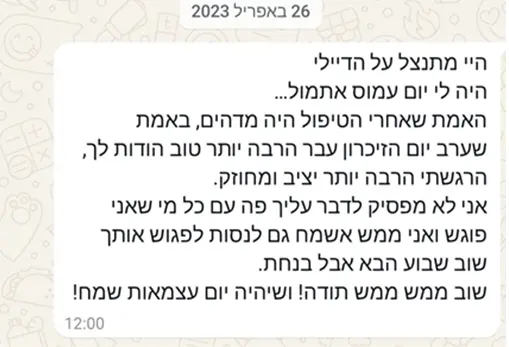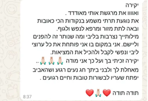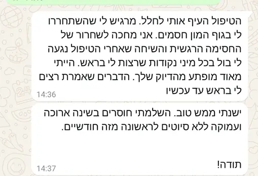 ומאז, גיליתי שניחנתי ביכולת יוצאת דופן – לגעת בכאב של אנשים מבלי שיצטרכו לומר דבר או להראות לי איפה כואב- אני רואה ויודעת באיזה מגע להשתמש ועד איזה עומק לגעת כדי להקל ולרפא.